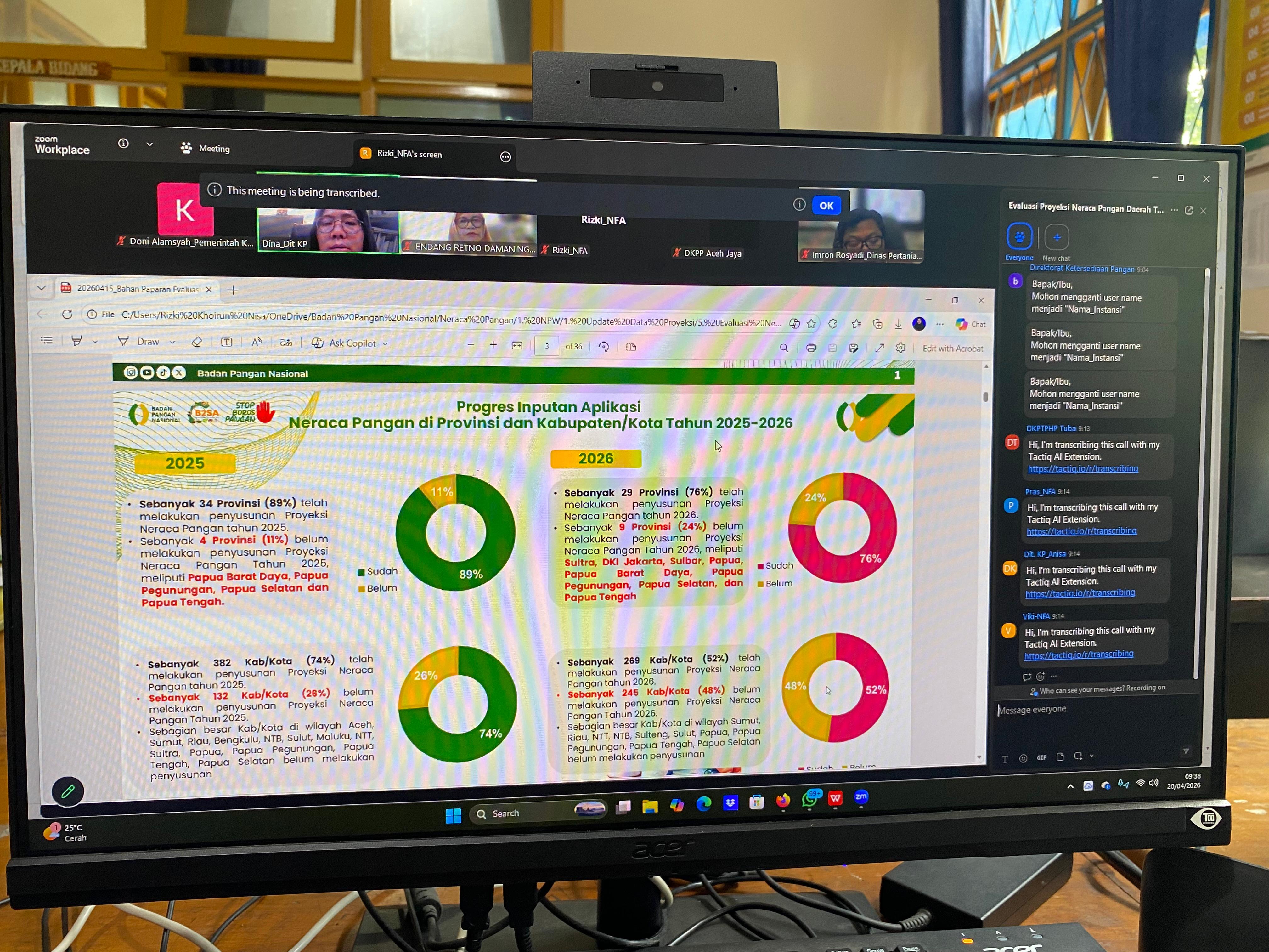 Pagar Alam, Senin (20 April 2026) - Dinas Ketahanan Pangan dan Perikanan Kota Pagar Alam mengikuti Zoom Meeting evaluasi proyeksi neraca pangan daerah tahun 2025 dan Triwulan I tahun 2026 yang diselenggarakan oleh Badan Pangan Nasional melalui Deputi Bidang Ketersediaan Pangan.