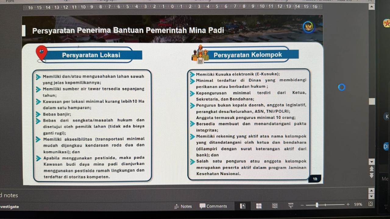 Dalam kegiatan tersebut, narasumber menyampaikan materi terkait persyaratan penerima bantuan pemerintah untuk program mina padi. Program ini merupakan salah satu upaya pemerintah dalam mendorong peningkatan produktivitas lahan melalui integrasi budidaya padi dan ikan secara efisien dan ramah lingkungan.