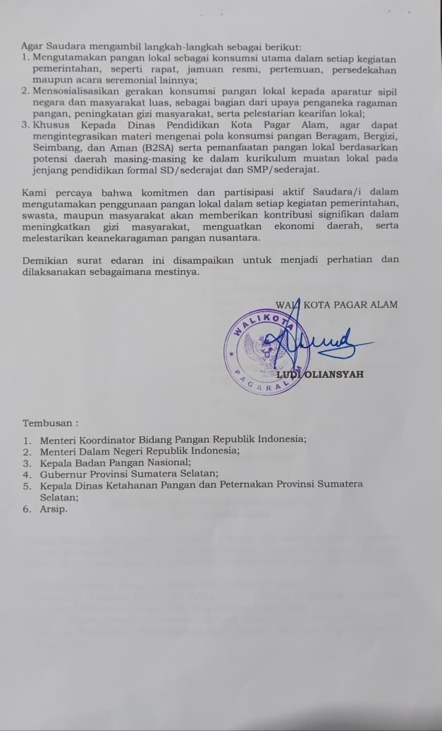 Dalam Rangka Mendukung Ketahanan Pangan dan Meningkatkan Konsumsi Pangan Berbasis Sumber Daya Lokal yang Beragam, Bergizi, Seimbang, dan Aman (B2SA), serta Melestarikan Kearifan Lokal. Dinas Ketahanan Pangan dan Perikanan Mengeluarkan Surat edaran Walikota Pagar Alam Nomor: 187/SE/DKPP-C/2025 Tanggal 20 November 2025, Tentang Himbauan Penggunaan Pangan Lokal di Kota Pagar Alam.