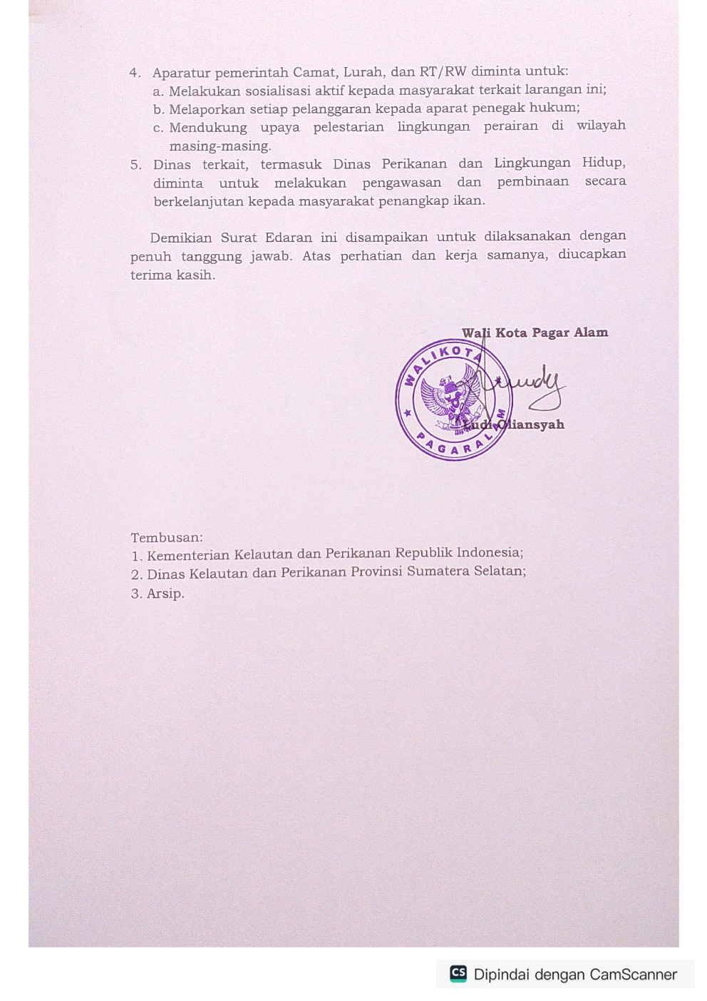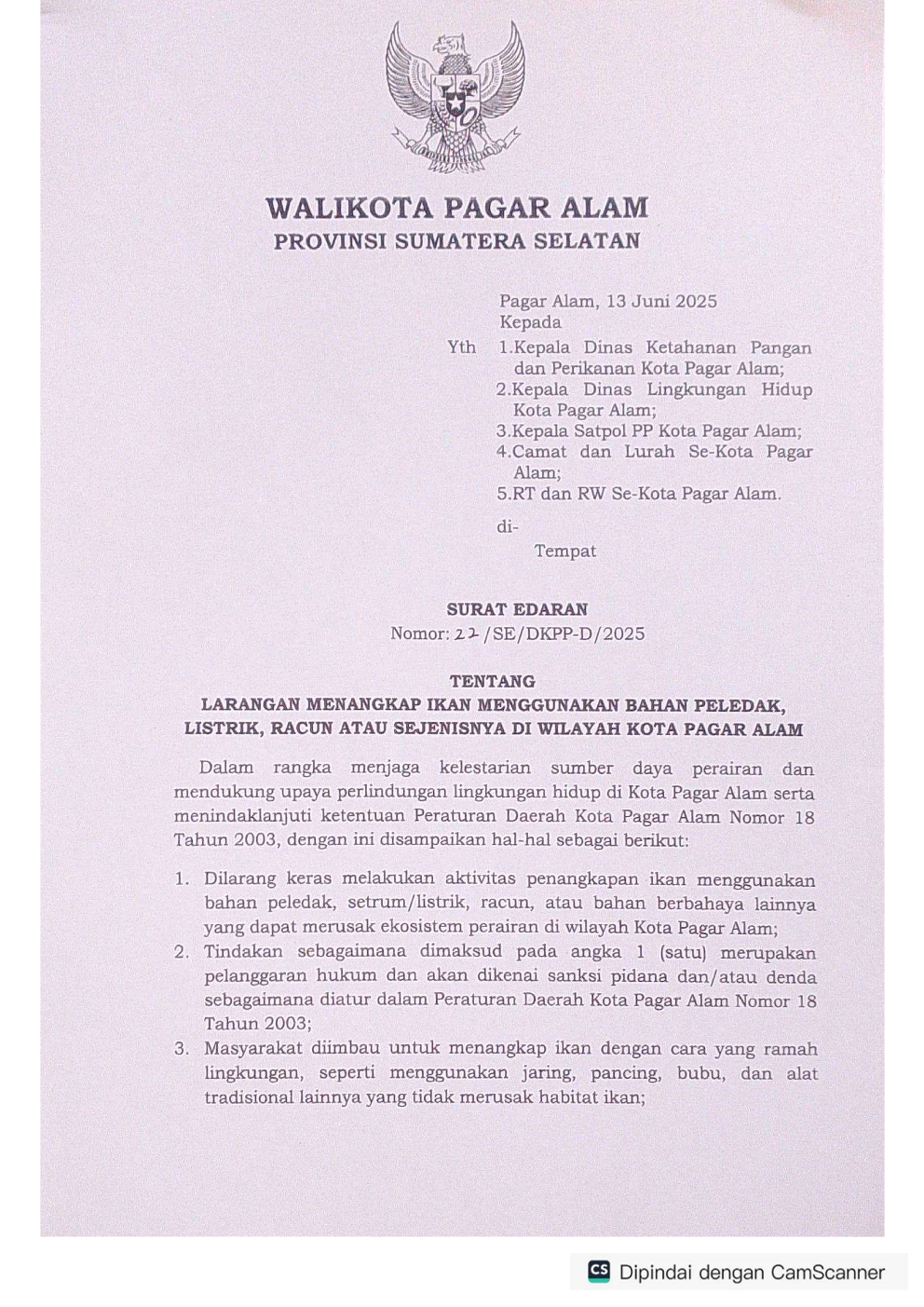 SURAT EDARAN WALI KOTA PAGAR ALAM NOMOR : 22 / SE / DKPP-D / 2025 TENTANG LARANGAN MENANGKAP IKAN MENGGUNAKAN BAHAN PELEDAK, LISTRIK, RACUN ATAU SEJENISNYA DI WILAYAH KOTA PAGAR ALAM